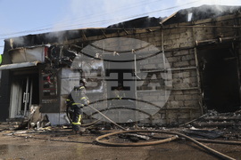 Rescue workers put out a fire at commercial stores, destroyed by a Russian missile attack on Zaporizhzhia, Ukraine, Monday, Aug. 18, 2025. (AP Photo/Kateryna Klochko)