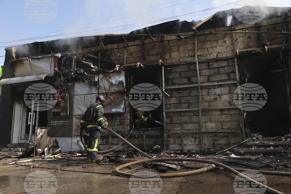 Rescue workers put out a fire at a commercial store, destroyed by a Russian missile attack on Zaporizhzhia, Ukraine, Monday, Aug. 18, 2025. (AP Photo/Kateryna Klochko)