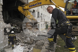 Rescue workers clear the rubble at a residential building damaged by a Russian attack on Kharkiv, Ukraine, Monday, Aug. 18, 2025. (AP Photo/Andrii Marienko)