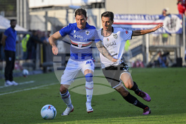 Sampdoria's Leonardo Benedetti, left, and Spezia's Antonio Candela, right, challenge for the ball during the Italian Cup soccer match between Spezia and Sampdoria in La Spezia, Monday, Aug. 18, 2025. (Tano Pecoraro/LaPresse via AP)