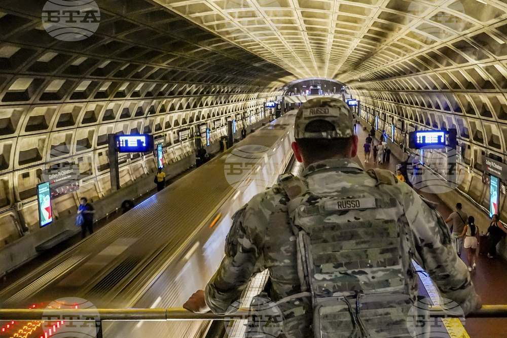 District of Columbia National Guardsmen watch a train pass through while on patrol inside the Gallery Place-Chinatown Metro Station, Sunday, Aug. 17, 2025, in Washington. (AP Photo/Julia Demaree Nikhinson)