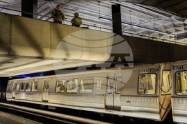 A District of Columbia National Guardsman watches a train pass through while on patrol inside the Gallery Place-Chinatown Metro Station, Sunday, Aug. 17, 2025, in Washington. (AP Photo/Julia Demaree Nikhinson)