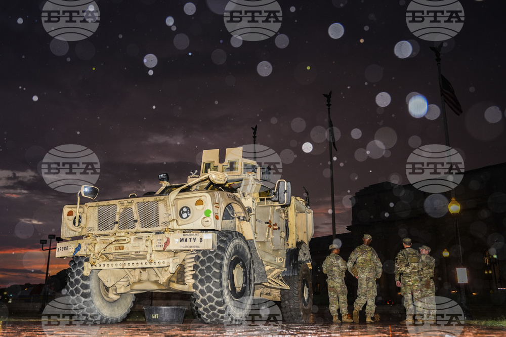 Members of the District of Columbia National Guard, stand next to an M-ATV infantry mobility vehicle, outside the Union Station in Washington, Monday, Aug. 18, 2025. (AP Photo/Manuel Balce Ceneta)