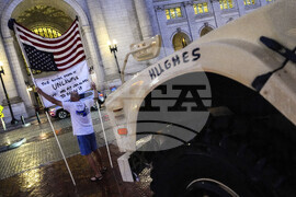 A protester holds a sign and an upside down American flag in front of a District of Columbia National Guard M-ATV outside Union Station, Sunday, Aug. 17, 2025, in Washington. (AP Photo/Julia Demaree Nikhinson)