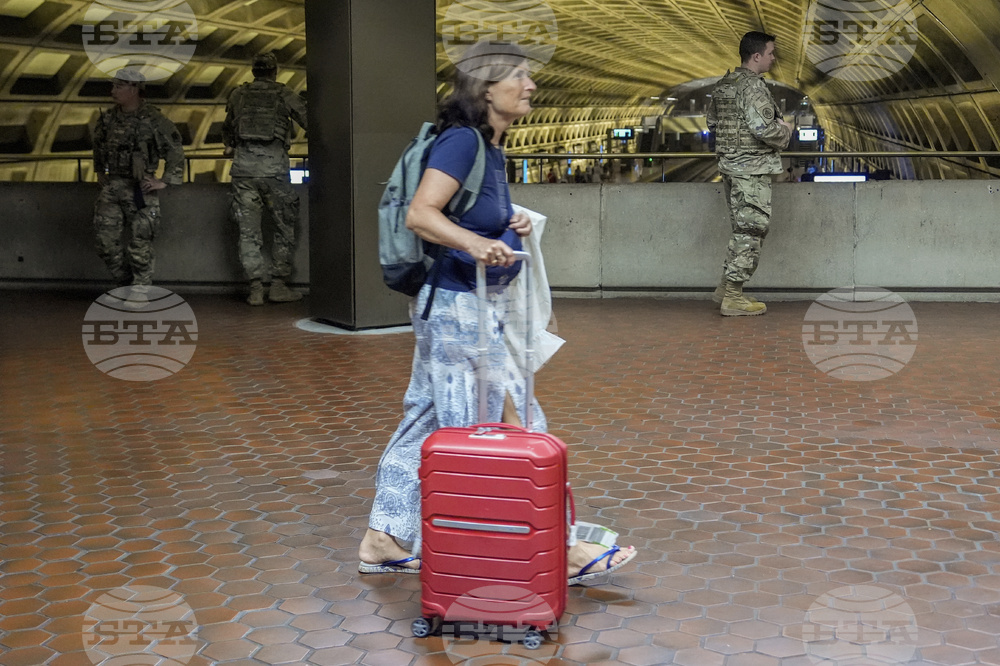A woman rolls her suitcase past as District of Columbia National Guardsmen patrol inside the Gallery Place-Chinatown Metro Station, Sunday, Aug. 17, 2025, in Washington. (AP Photo/Julia Demaree Nikhinson)