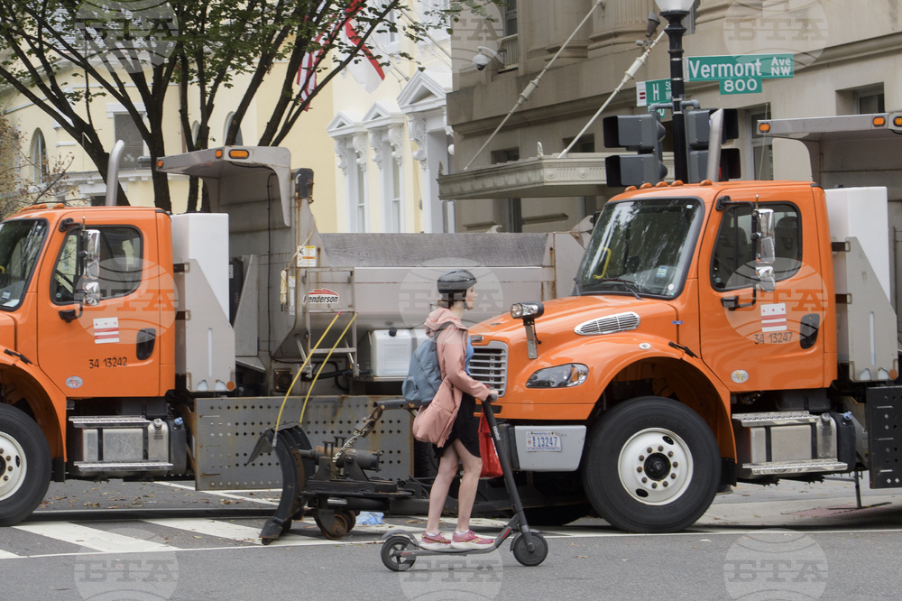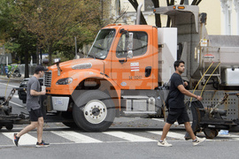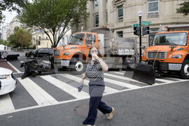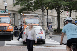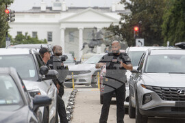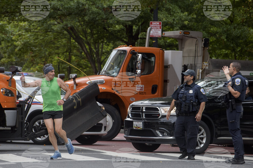 People navigate the security measures set up in advance of President Donald Trump's meeting with Ukrainian President Volodymyr Zelensky and European leaders at the White House in Washington, Monday, Aug. 18, 2025. (AP Photo/Rod Lamkey, Jr.)