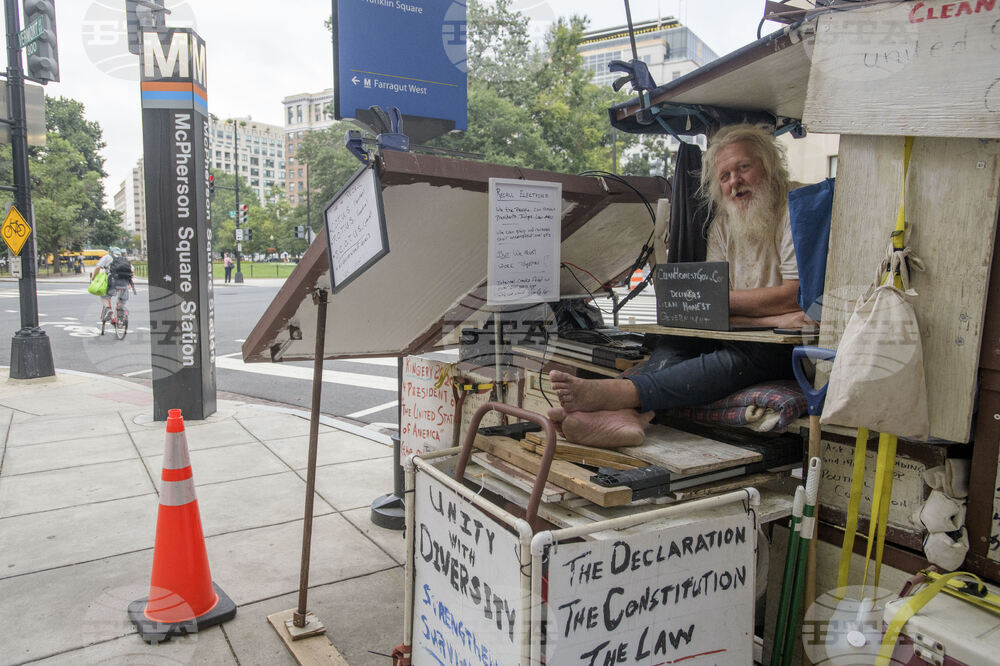Daniel Kingery, who has been living on the streets of the nations capital for about seven years, takes time for a portrait in his homemade shelter nearly three blocks away from the White House in Washington, Monday, Aug. 18, 2025. Mr. Kingery says he has not, so far, been told to relocate. (AP Photo/Rod Lamkey, Jr.)