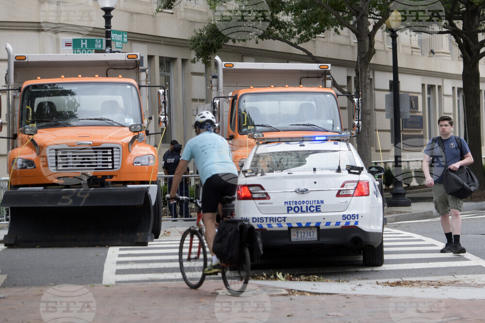 People navigate the security measures set up in advance of President Donald Trump's meeting with Ukrainian President Volodymyr Zelenskyy and European leaders at the White House in Washington, Monday, Aug. 18, 2025. (AP Photo/Rod Lamkey, Jr.)