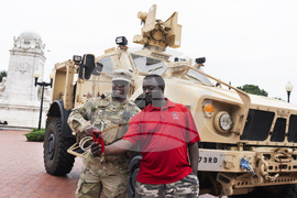 District of Columbia Army National Guard Staff Sgt. Snowden, left, shows James Maseno of Grandlel, Md., how to take a selfie next to an M-ATV infantry mobility vehicle, outside the Union Station in Washington, Monday, Aug. 18, 2025. (AP Photo/Manuel Balce Ceneta)