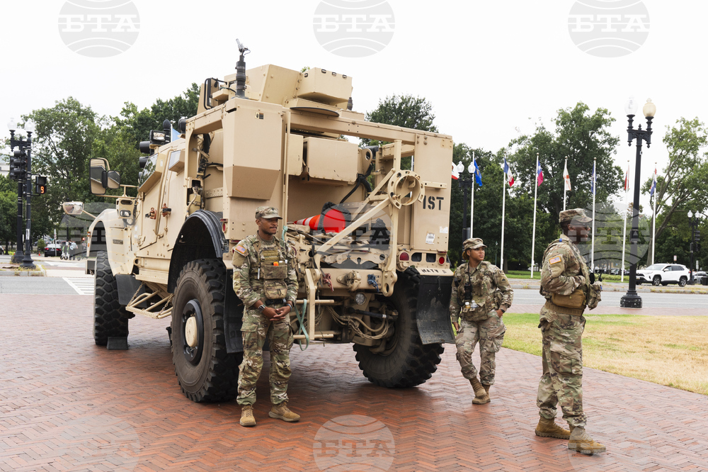 Members of the District of Columbia National Guard stand next to their M-ATV outside Union Station, Sunday, Aug. 17, 2025, in Washington. (AP Photo/Julia Demaree Nikhinson)