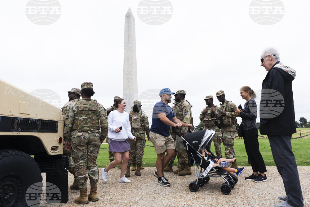 Ryan Cummings, center, with his wife Kelly Cummings, third from left, of Vernon, Vermont, pushes their children in a baby stroller between District of Columbia Army National Guardsmen on the National Mall in Washington, Monday, Aug. 18, 2025. The Washington Monument stands behind. (AP Photo/Manuel Balce Ceneta)