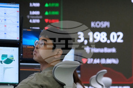 A currency trader watches monitors near a screen showing the Korea Composite Stock Price Index (KOSPI) at the foreign exchange dealing room of the Hana Bank headquarters in Seoul, South Korea, Monday, Aug. 18, 2025. (AP Photo/Ahn Young-joon)