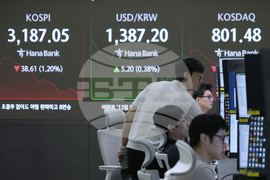 Currency traders watch monitors near a screen showing the Korea Composite Stock Price Index (KOSPI), left, and the foreign exchange rate between U.S. dollar and South Korean won at the foreign exchange dealing room of the Hana Bank headquarters in Seoul, South Korea, Monday, Aug. 18, 2025. (AP Photo/Ahn Young-joon)