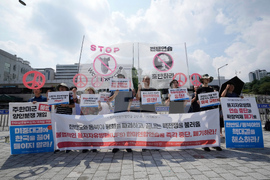 South Korean protesters stage a rally to oppose the joint military exercises, Ulchi Freedom Shield or UFS, between the U.S. and South Korea in front of the presidential office in Seoul, South Korea, Monday, Aug. 18, 2025. The banners read "Stop the military exercise between the U.S. and South Korea." (AP Photo/Ahn Young-joon)