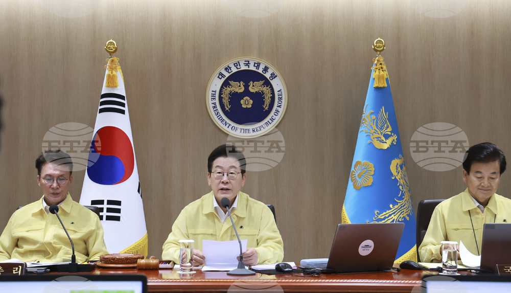 South Korean President Lee Jae Myung, center, speaks during a cabinet meeting at the presidential office in Seoul, South Korea, Monday, Aug. 18, 2025. (Hong Hae-in/Yonhap via AP)