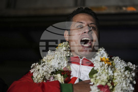 Vice-presidential candidate Edman Lara greets supporters during a rally a day after he and his running mate Rodrigo Paz won a plurality in the first round of the presidential election, in El Alto, Bolivia, Monday, Aug. 18, 2025. (AP Photo/Juan Karita)