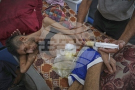 Atef Arhouma feeds his injured son, Karam Arhouma, 22, lentil soup through a syringe at Shifa Hospital, where doctors say he is showing signs of malnutrition, in Gaza City, Monday, Aug. 18, 2025. (AP Photo/Abdel Kareem Hana)