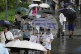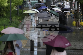 People walk with umbrellas during the rain in Beijing, China, Tuesday, Aug. 19, 2025. (AP Photo/Mahesh Kumar A.)