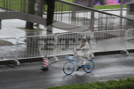 A women rides a bicycle in the rain in Beijing, China, Tuesday, Aug. 19, 2025. (AP Photo/Mahesh Kumar A.)