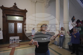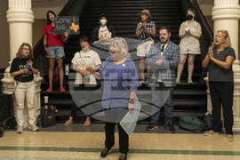 Cathy Crane chants "let her out" as a group protests the confinement of Rep. Nicole Collier, D-Fort Worth, outside the House Chamber at the Texas Capitol in Austin, Tuesday, Aug. 19, 2025. (Mikala Compton/Austin American-Statesman via AP)