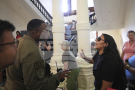 Serjeants-at-arms stand at the door of the House Chamber where Democratic Texas state Rep. Nicole Collier refuses to leave due to a required law enforcement escort, Tuesday, Aug. 19, 2025, in Austin, Texas. (AP Photo/Eric Gay)
