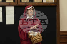 Sam Parker wears a "Handmaid's Tale" outfit as she stands outside of the House Chamber where Democratic Texas state Rep. Nicole Collier refuses to leave due to a required law enforcement escort, Tuesday, Aug. 19, 2025, in Austin, Texas. (AP Photo/Eric Gay)