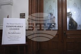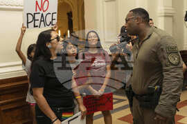 Protesters gather outside of the House Chamber where Democratic Texas Rep. Nicole Collier refuses to leave due to a required law enforcement escort, Tuesday, Aug. 19, 2025, in Austin, Texas. (AP Photo/Eric Gay)