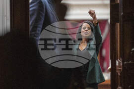 Democratic Texas state Representatives, from left, Penny Morales Shaw, Rhetta Andrews Bowers, Mihaela Plesa, and Cassandra Garcia Hernandez prepare to join fellow Rep. Nicole Collier who refuses to leave due to a required law enforcement escort, Tuesday, Aug. 19, 2025, in Austin, Texas. (AP Photo/Eric Gay)