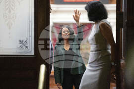 Texas state Rep. Nicole Collier, left, waves past Texas state Sen. Carol Alvarado, right, to supporters outside of the House Chamber where she refuses to leave due to a required law enforcement escort, Tuesday, Aug. 19, 2025, in Austin, Texas. (AP Photo/Eric Gay)