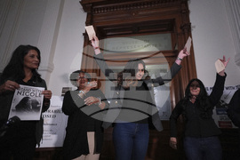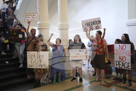 Protesters gather outside of the House Chamber where Democratic Texas state Rep. Nicole Collier refuses to leave due to a required law enforcement escort, Tuesday, Aug. 19, 2025, in Austin, Texas. (AP Photo/Eric Gay)