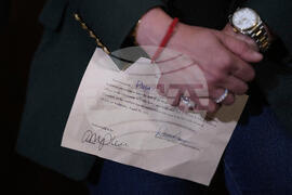 Democratic Texas state Rep. Plesa's ripped up 'permission slip' is seen outside the House Chamber after she and other democrats joined fellow Rep. Nicole Collier who refuses to leave due to a required law enforcement escort, Tuesday, Aug. 19, 2025, in Austin, Texas. (AP Photo/Eric Gay)