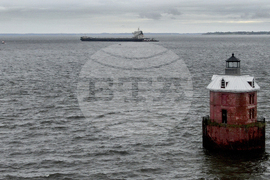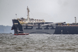 A Liberian commercial cargo vessel named W-Sapphire, that had an explosion late Monday on-board, is towed by tugboats near the Sandy Point Shoal Light in Annapolis, Md., Tuesday, Aug. 19, 2025, off the shore of the Sandy Point State Park. (Jeffrey F. Bill/The Baltimore Sun via AP)