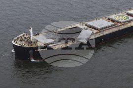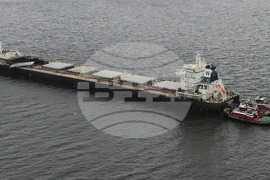 The W-Sapphire bulk carrier is seen anchored off Sandy Point, Md., the morning after an explosion occurred in one of its holds as it was leaving the Port of Baltimore, Tuesday, Aug. 19, 2025. (Jerry Jackson/The Baltimore Banner via AP)
