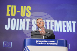 European Commissioner for Trade and Economic Security, Maros Sefcovic speaks during a media conference at EU headquarters in Brussels, Belgium, Thursday, Aug. 21, 2025. (AP Photo/Virginia Mayo)