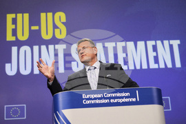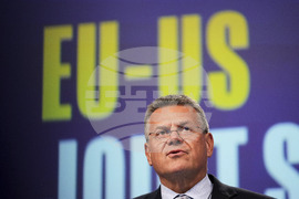 European Commissioner for Trade and Economic Security, Maros Sefcovic, speaks during a media conference at EU headquarters in Brussels, Belgium, Thursday, Aug. 21, 2025. (AP Photo/Virginia Mayo)
