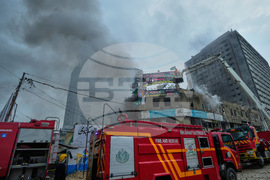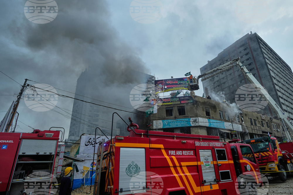 Firefighters try to extinguish a fire following an explosion at a fireworks storage facility, in Karachi, Pakistan, Thursday, Aug. 21, 2025. (AP Photo/Fareed Khan)