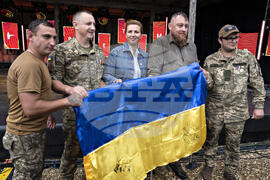 Prime Minister Mette Frederiksen is seen here with Ukrainian veterans during the opening of the 'Culture Meeting Mors 2025' in Nykoebing Mors, Denmark, Thursday, Aug. 21. (Henning Bagger/Ritzau Scanpix via AP)