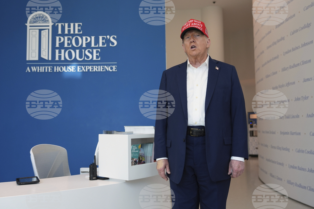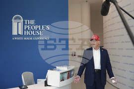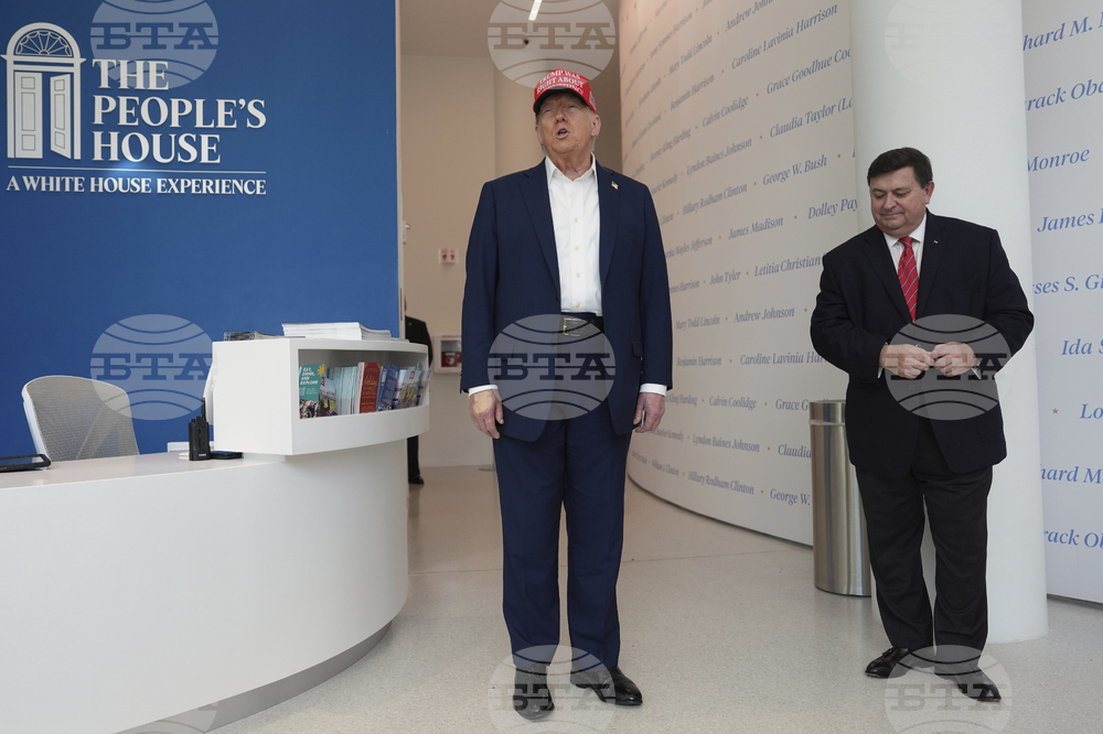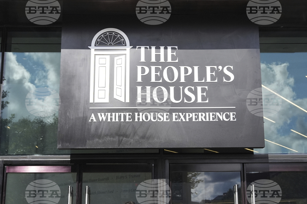 The entrance to The People's House museum is pictured before President Donald Trump speaks, Friday, Aug. 22, 2025, in Washington. (AP Photo/Evan Vucci)