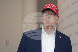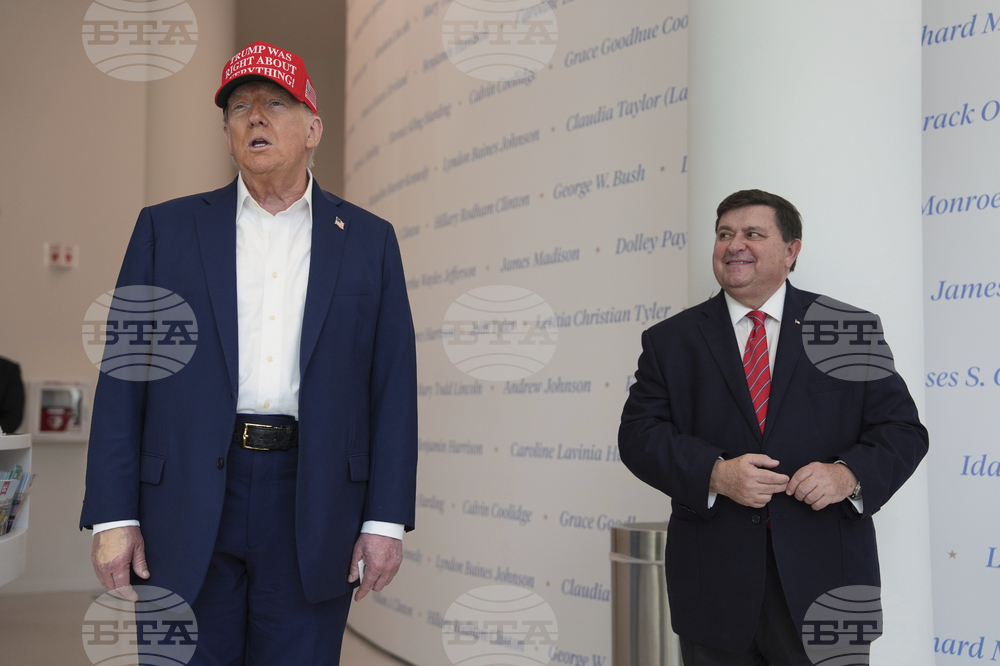 President Donald Trump, left, arrives to speak with reporters alongside Stewart McLaurin, president of the White House Historical Association, during a visit to The People's House museum, Friday, Aug. 22, 2025, in Washington. (AP Photo/Evan Vucci)