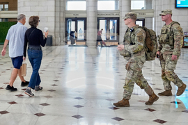 District of Columbia National Guard soldiers keep watch as travelers arrive at the entrance to Union Station near the Capitol, Thursday, Aug 21, 2025, in Washington. (AP Photo/Mariam Zuhaib)