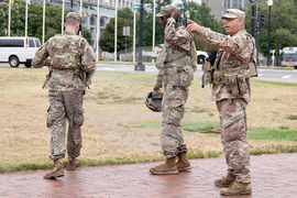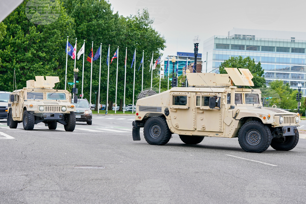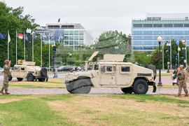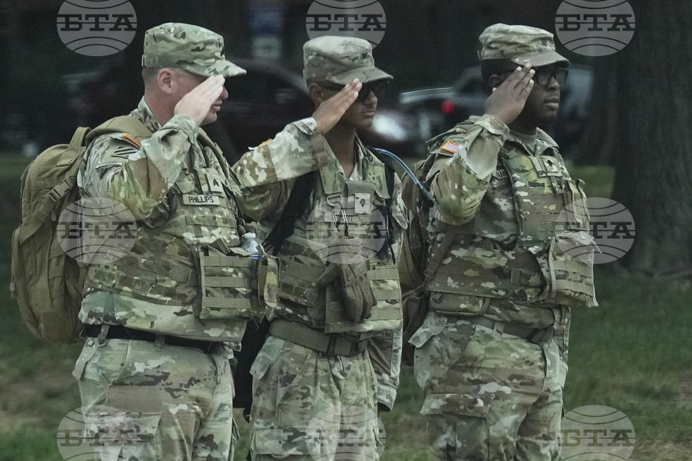 National Guard soldiers salute as the motorcade carrying President Donald Trump, passes by near the White House, Thursday, Aug. 21, 2025, in Washington. (AP Photo/Jacquelyn Martin)