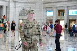 A District of Columbia National Guard soldier keeps watch as travelers arrive at the entrance to Union Station near the Capitol, Thursday, Aug 21, 2025, in Washington. (AP Photo/Mariam Zuhaib)