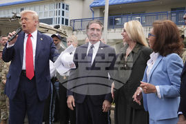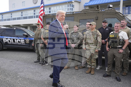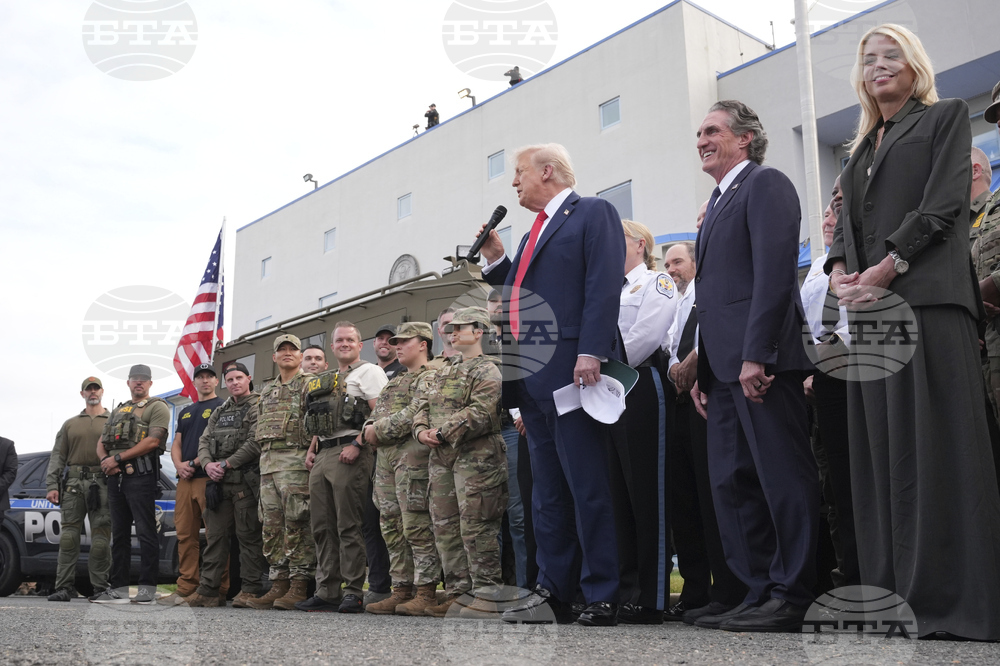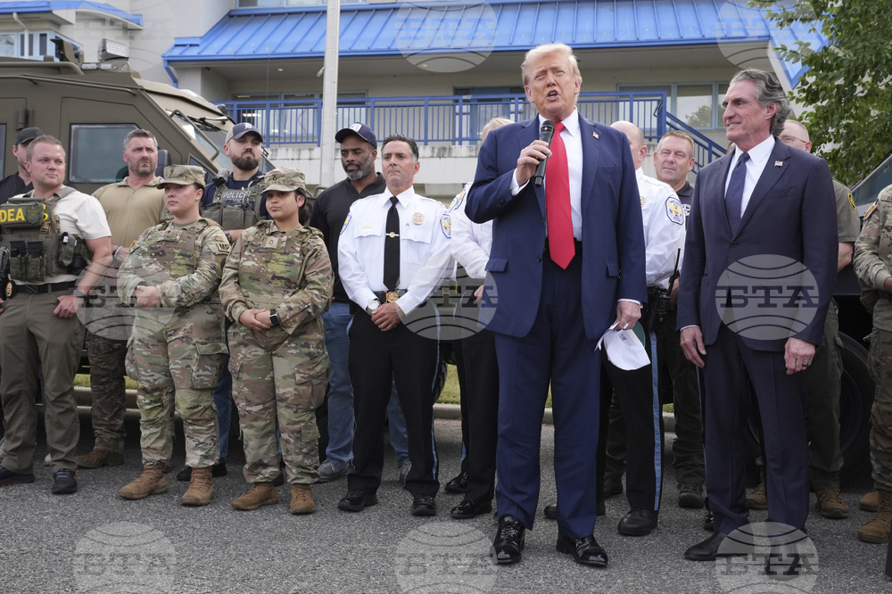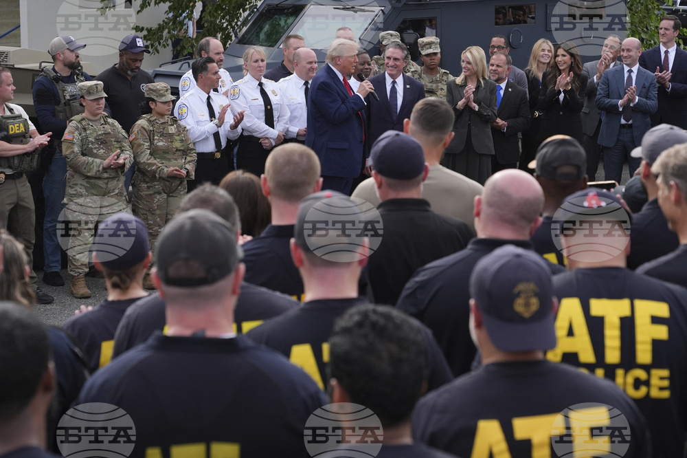 President Donald Trump speaks with members of law enforcement and National Guard soldiers, Thursday, Aug. 21, 2025, in Washington, as Interior Secretary Doug Burgum listens at right. (AP Photo/Jacquelyn Martin)