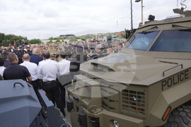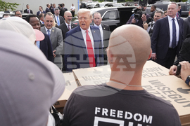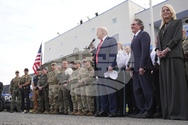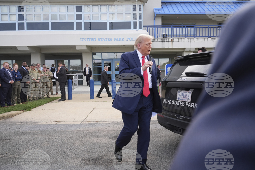 People are reflected in the glass as President Donald Trump arrives to speaks with members of law enforcement and National Guard soldiers, Thursday, Aug. 21, 2025, in Washington. (AP Photo/Jacquelyn Martin)