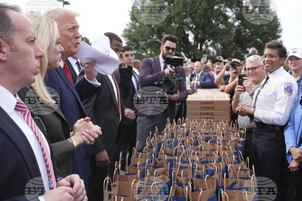 President Donald Trump hands out pizza as he speaks with members of law enforcement and National Guard soldiers, Thursday, Aug. 21, 2025, in Washington, as Leo Terrell watches, second from left. (AP Photo/Jacquelyn Martin)