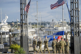 West Virginia National Guardsmen walk along a pier as they patrol the The Wharf in Washington, Thursday, Aug. 21, 2025. (AP Photo/Rod Lamkey, Jr.)