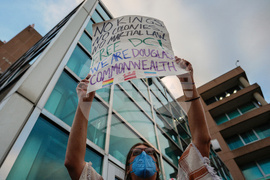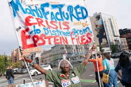 A demonstrator holds a banner during a protest against President Donald Trump's use of federal law enforcement and National Guard troops along the U street corridor in northwest Washington Thursday, Aug. 21, 2025. (AP Photo/Jose Luis Magana)