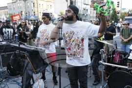 Musicians play go-go music as people rally against President Donald Trump's use of federal law enforcement and National Guard troops along the U Street corridor in northwest Washington Thursday, Aug. 21, 2025. (AP Photo/Jose Luis Magana)