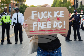 EDS NOTE: OBSCENITY - A person rallies against President Donald Trump's use of federal law enforcement and National Guard troops in Washington, Thursday, Aug. 21, 2025, in Washington. (AP Photo/Julia Demaree Nikhinson)