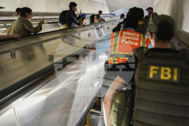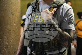 An FBI officer stands by as District of Columbia Metro Transit Police Department and Metropolitan Police Department officers detain three people at L'Enfant Plaza metro station, Thursday, Aug. 21, 2025, in Washington. (AP Photo/Julia Demaree Nikhinson)